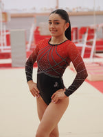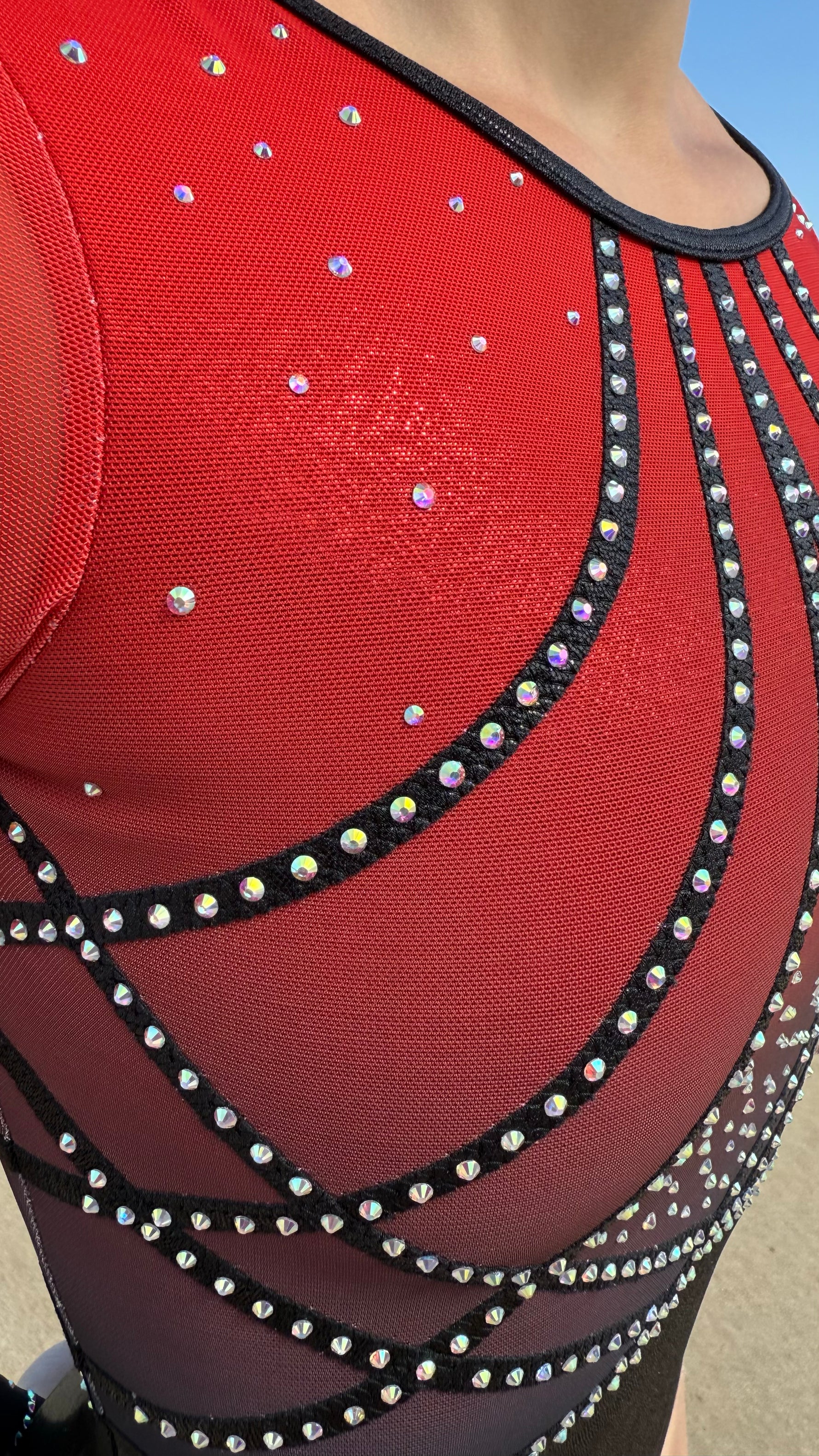 ce justaucorps rouge et noir est conçu avec finesse. Le buste est en voile est doublé d'un tissu poudré pour un effet scintillant. Les strass sont de couleur AB pour une meilleure brillance.